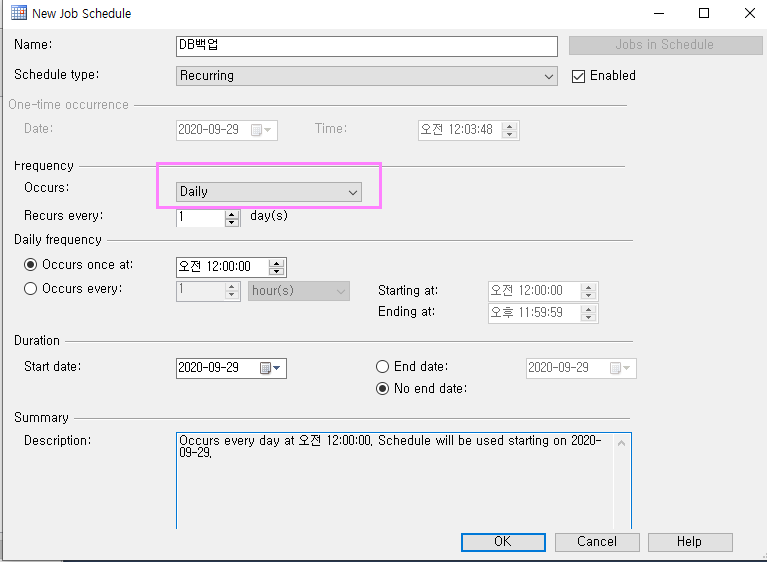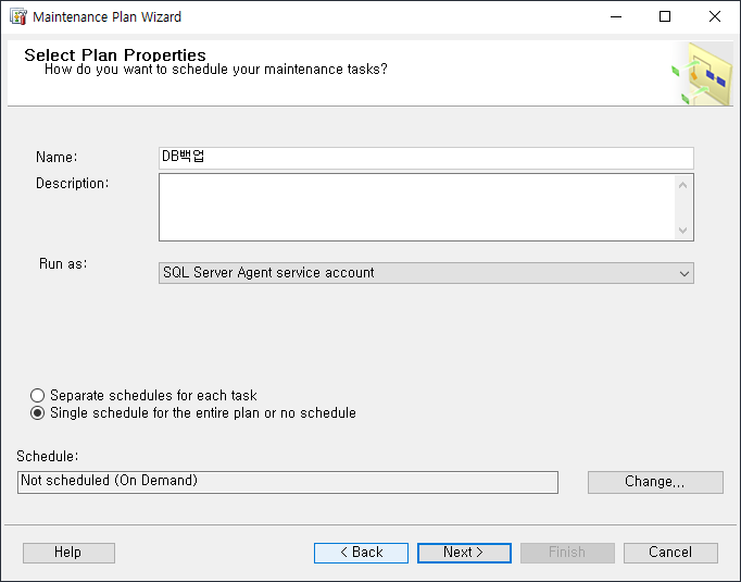 작업명에 DB백업이라 입력하여 진행.