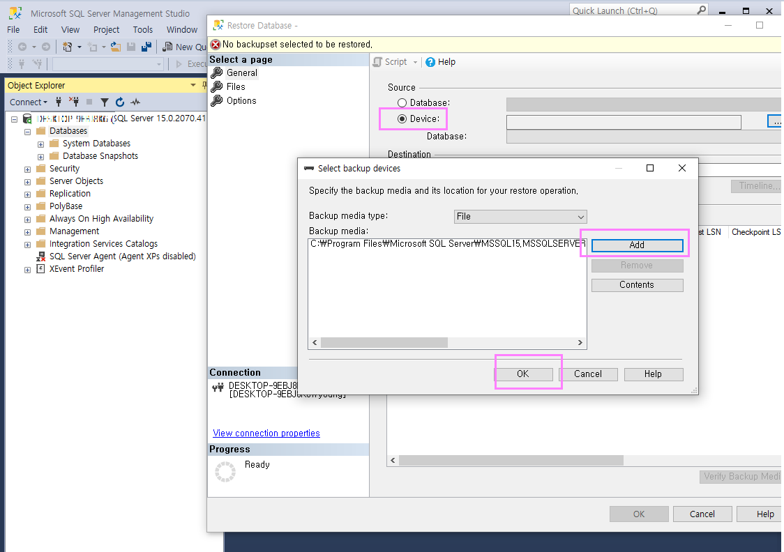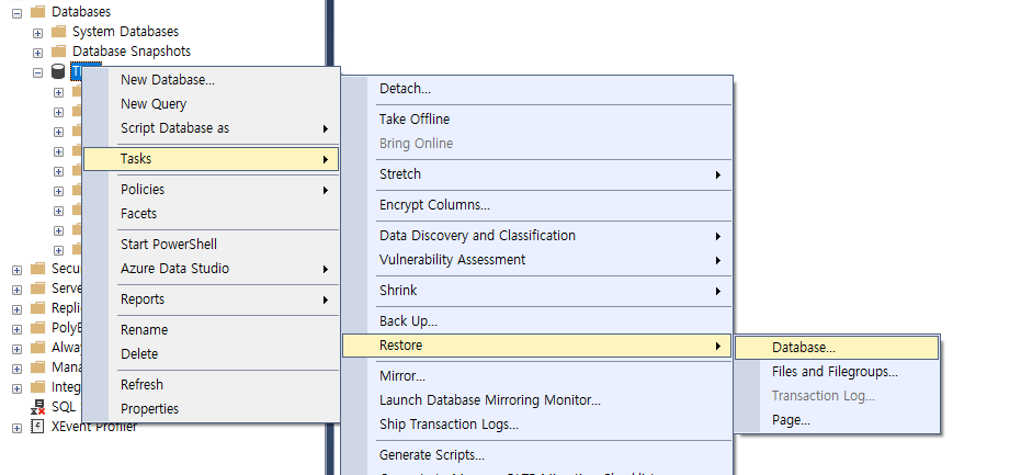데이터베이스선택 -> Tasks->Restore->Database항목을 선택합니다.
