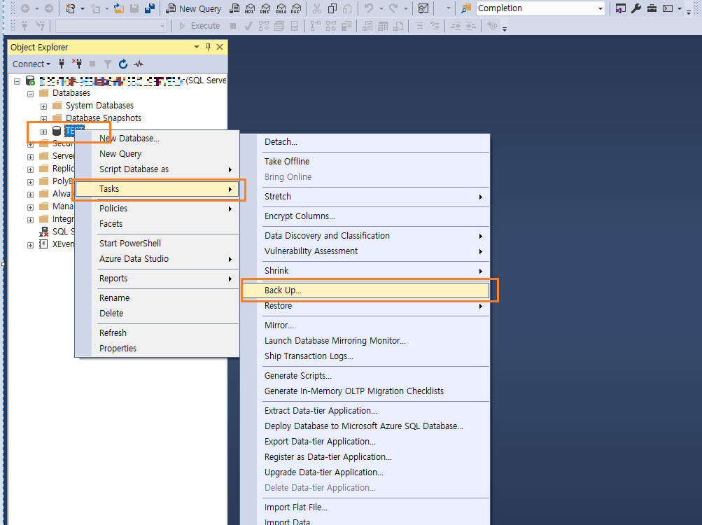 TEST DB에 마우스오른쪽 버튼을 클릭 -> Task -> Back Up항목을 선택합니다.