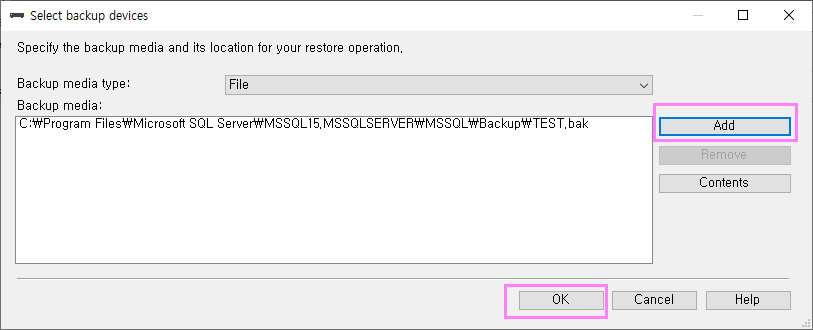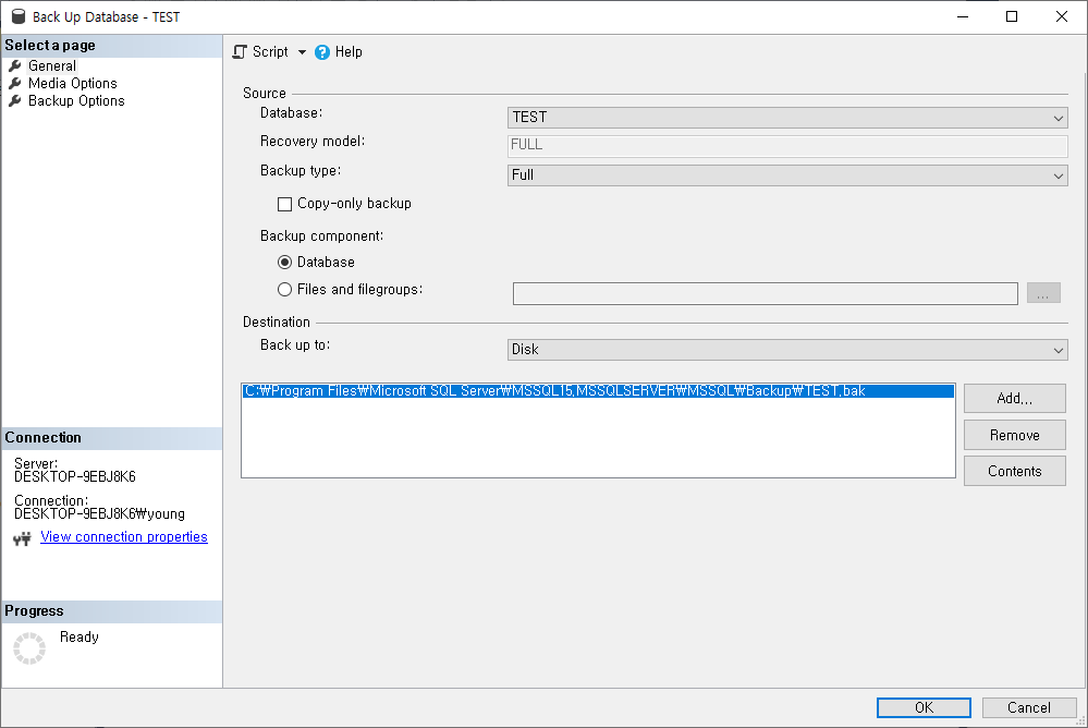 Backup Type을 Full(전체)로 하여 백업하도록 하겠습니다. 폴더를 지정하지 않으면 "C:\\Program Files\\Microsoft SQL Server\\MSSQL15.MSSQLSERVER\\MSSQL\\DATA" 하위폴더에 백업파일이 생성됩니다.