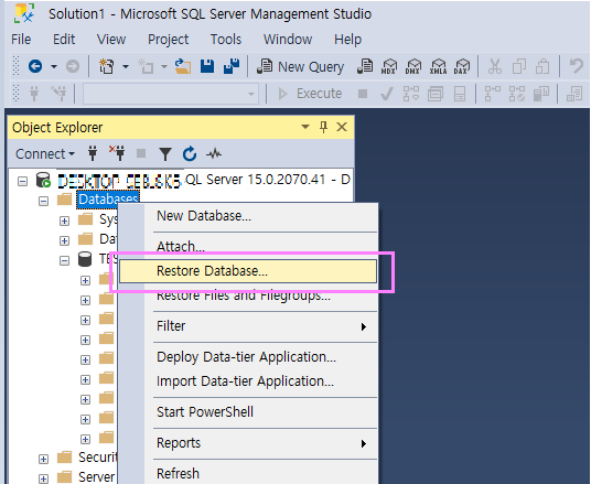 DataBases항목에서 마우스오른쪽 버튼을 클릭하셔 Restore Database항목을 선택합니다.