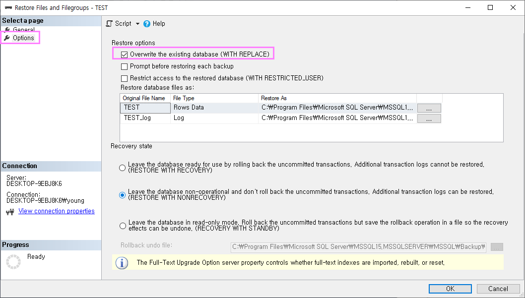간혹 데이터베이스가 사용중이거나 복구가 되지 않을경우에는 Options항목에서 강제로 Overwrite하는 옵션을 체크해서 복구하면됩니다.