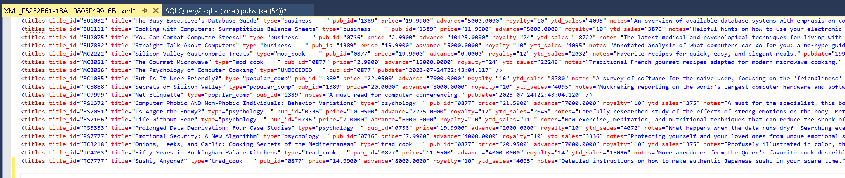 SELECT * FROM titles for xml auto 명령문으로 조회결과를 xml자료로 만들어 보겠습니다. 아래와 같이 결과값이 나타납니다. 쿼리결과에 보면 xml으로 변경된 부분을 알수 있습니다. 해당부분 결과값을 클릭합니다.