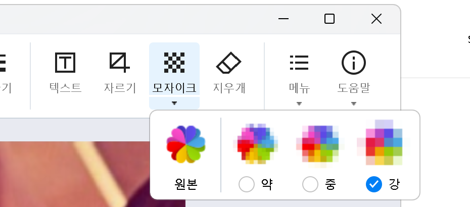 모자이크 메뉴에서 강도를 조정하여 모자이크 효과를 줄 수 있습니다.