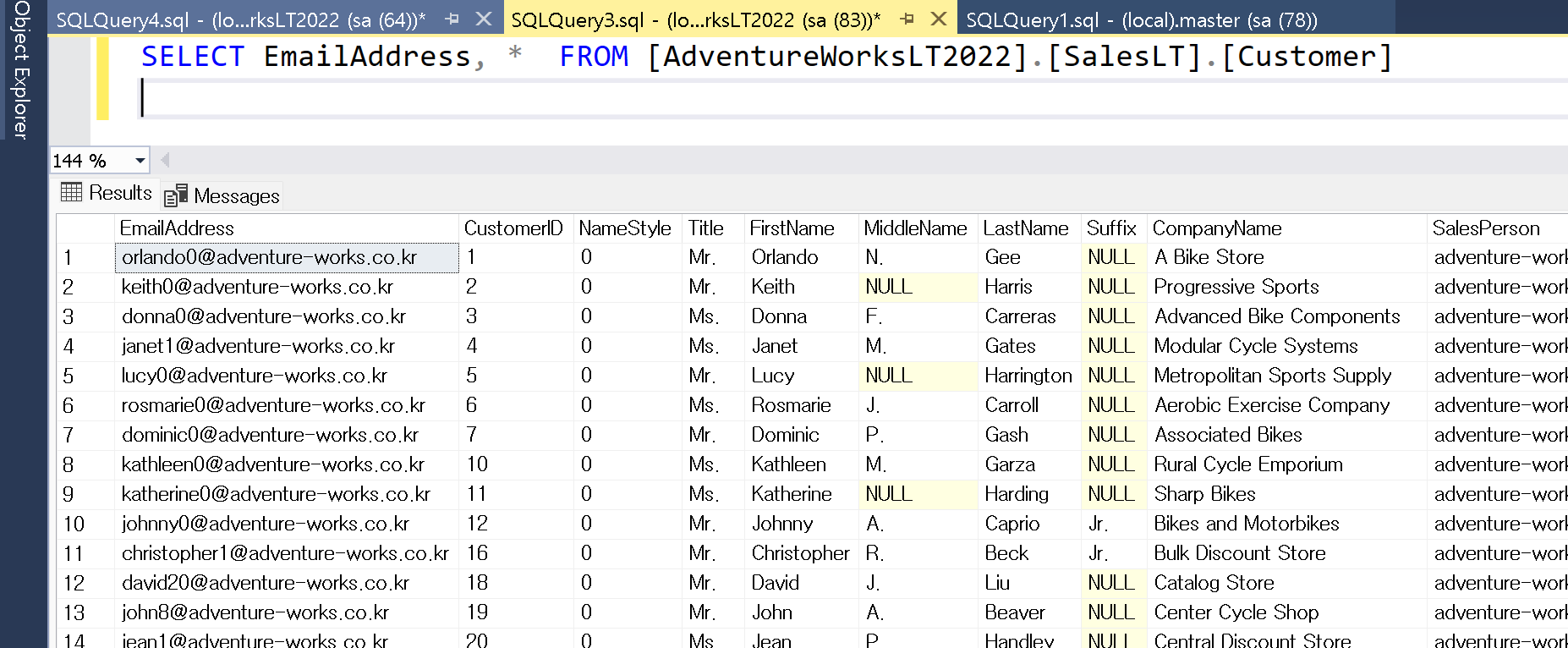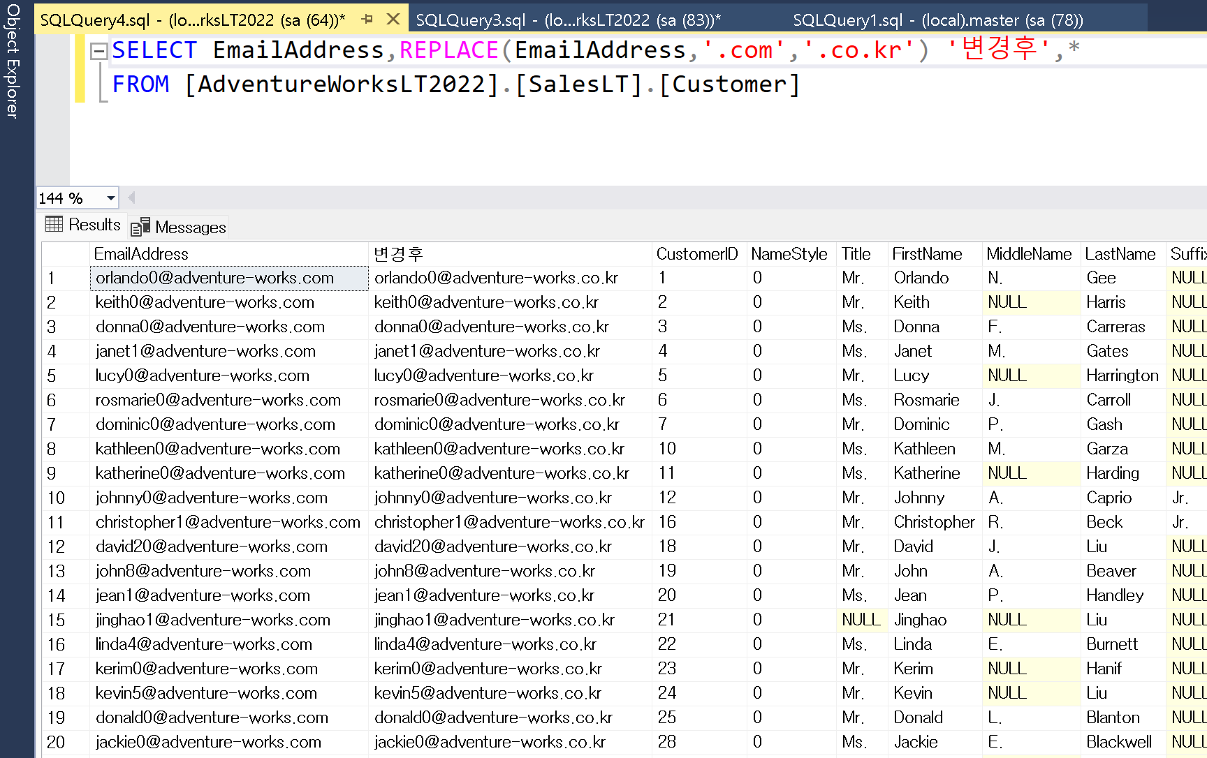 1. Replace문을 사용하기 AdventureWorks데이터베이스의 Customer테이블의 EmailAddress의 .com도메인은 .co.kr로 변경해보겠습니다. 데이터를 변경할때는 Update문을 바로 하기보다는 Select문으로 결과값을 미리 확인 후 업데이트 하는게 좋습니다.