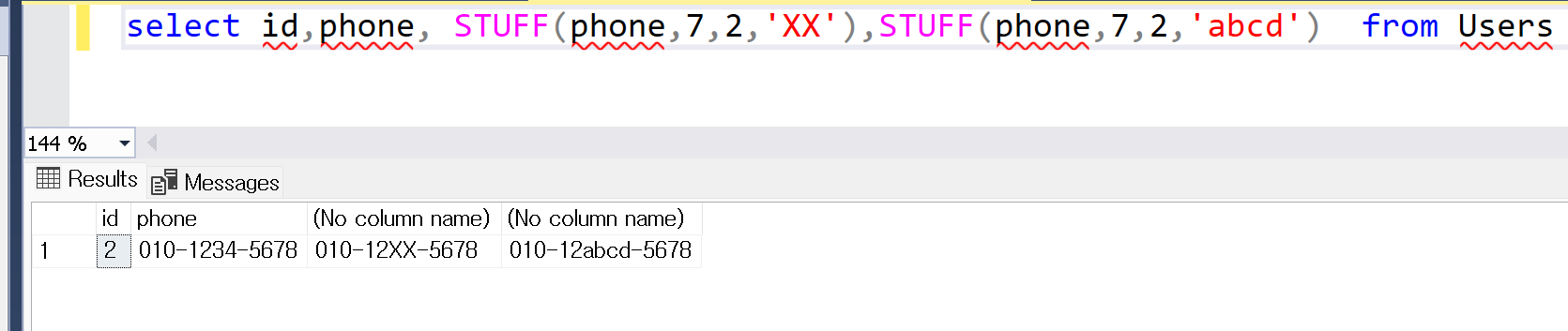 2. STUFF 사용하기 STUFF를 사용하여 아래와 같이 특정위치에 있는 문자열을 대체할 수 있습니다. STUFF(phone,7,2,'XX')의 결과값을 보면 7번째 자리에서 두문자의 값 34가 XX로 대체합니다. STUFF(phone,7,2,'abcd')의 결과는 34대신 abcd값으로 대체됩니다.