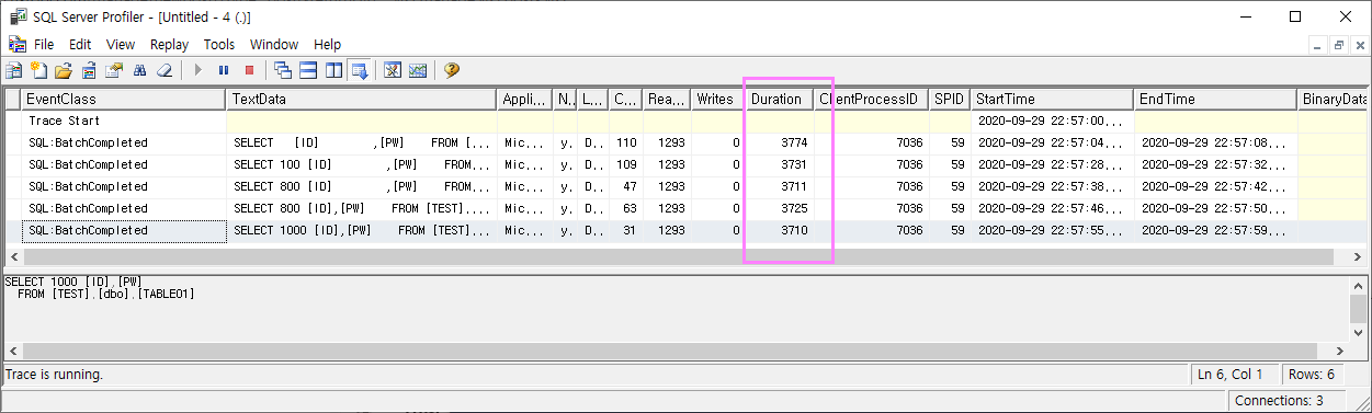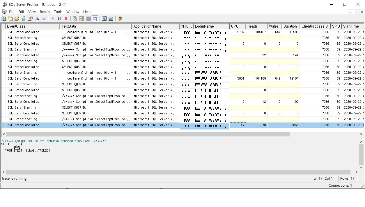 Run버튼을 선택하여 추적을 시작합니다. 추적을 시작하면 아래와 같이 TSQL문과 저장프로시저에 대한부분을 추적할수 있습니다. 항목에 대하여 살펴보도록 하겠습니다.