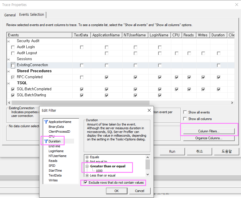 이번에는 모든 쿼리를 확인할수 없기때문에 필터를 걸어서 추척하는 방법에 대해 설명드리겠습니다. Duration값이 1000ms보다 큰경우에대하여 필터를 걸어보겠습니다. 추적화면에서 오른쪽 하단에 Column Filters버튼을 클릭합니다. Edit Filter화면이 나타나고 Duration항목을 선택합니다. Creater than or equal 항목에 1000을 입력합니다. 결과값이 없는 행을 제외하는 옵션(Exclude rows that do not contain values)을 체크하도록 하겠습니다.