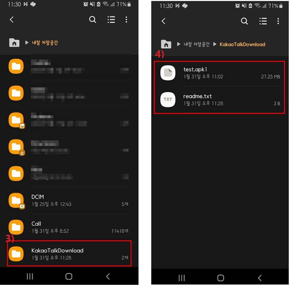 휴대폰 카카오톡에서 파일을 다운받았을때의 파일 경로입니다. 카카오톡에서 다운로드 받은 이미지나 문서 설치파일등이 저장된 위치입니다.