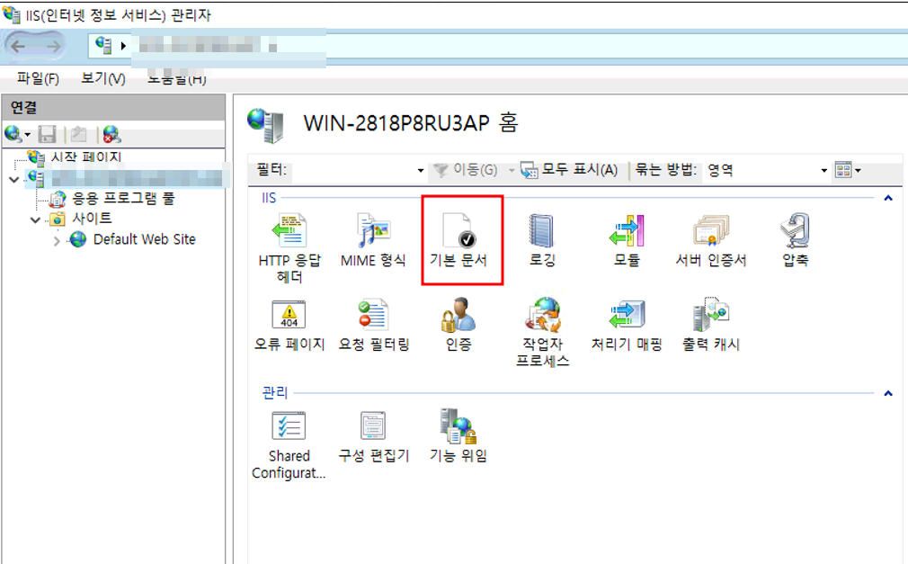 IIS관리자 메뉴에서 Default Web Site -> 기본문서항목을 선택합니다.