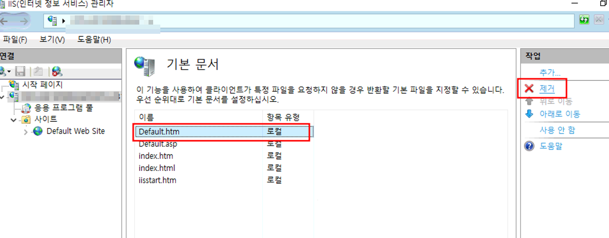 기본 문서 항목에 Default.htm, Default.asp, index.htm, index.html, iisstart.htm파일을 선택 후 작업메뉴에 제거버튼을 눌러 삭제합니다. 이제 기본 사이트 접속을 하여도 기본페이지가 나타나지 않습니다.