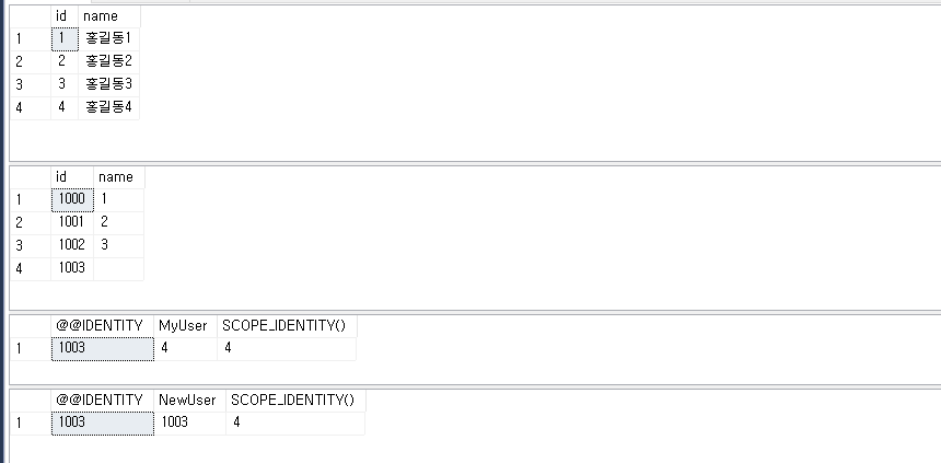 결과를 보면 @@IDENTITY, SCOPE_IDENTITY() 값이 동일하게 나오는것을 확인할수 있습니다.