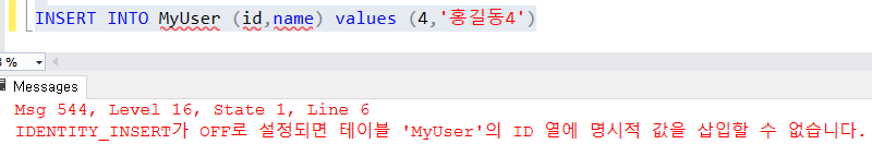 비어있는 ID값을 넣기위해는 자동증가열에 ID값을 넣을수있도록 설정해주어야합니다. ID값을 지정해서 데이터를 넣으면 아래 이미지와 같이 에러가 발생합니다. 기본적으로 ID값을 넣지 않게되어있어서 SET IDENTITY_INSERT .. ON 명령을 통해서 ID값을 넣을수 있도록 활성화 해주어야합니다.