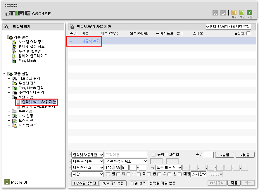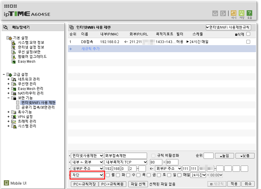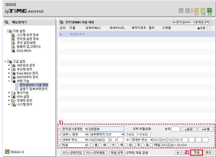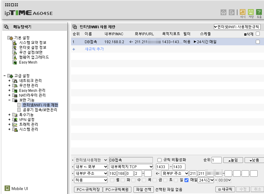 - MSSQL데이터베이스를 특정외부 IP(211.211.XXX.XXX)에서 접속이 가능하도록만 설정을 해보겠습니다. 보안기능->인터넷/WIFI사용제한-> 새규칙 추가를 클릭합니다.