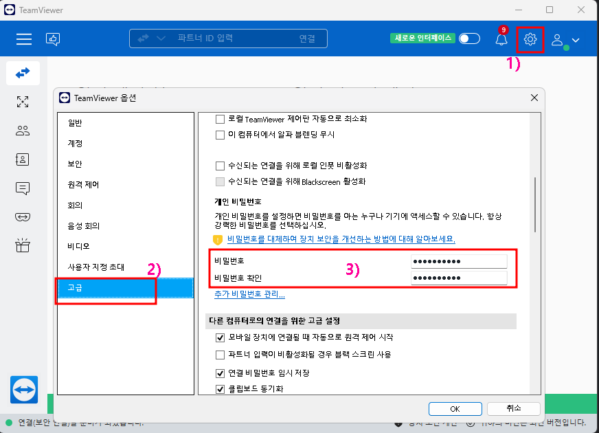 팀뷰어로 원격을 기본적으로는 재 실행하면 접속 비밀번호가 변경이 됩니다. 재 실행해도 비밀번호를 변경되지 않도록 하기 위해서는 비밀번호를 설정해야합니다.