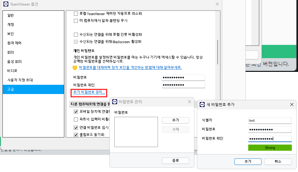 비밀번호를 등록해두면 이제 팀뷰어 재실행이 되거나 하여도 해당비번으로 원격접속이 가능합니다. 비밀번호의 경우는 복잡하게 설정하여 보안을 강화하는게 좋습니다.