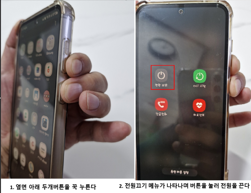 - 옆쪽 버튼 두개를 길게 누르면 전원끄기와 재시작 화면이 나타나며 전원끄기 선택하여 전원을 끌 수 있습니다.
