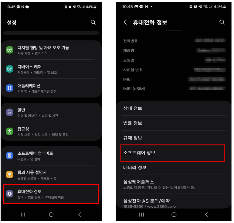 설정메뉴의 휴대전화정보 항목을 선택합니다. 휴대전화 정보메뉴에서 소프트웨어 정보 항목을 선택합니다.