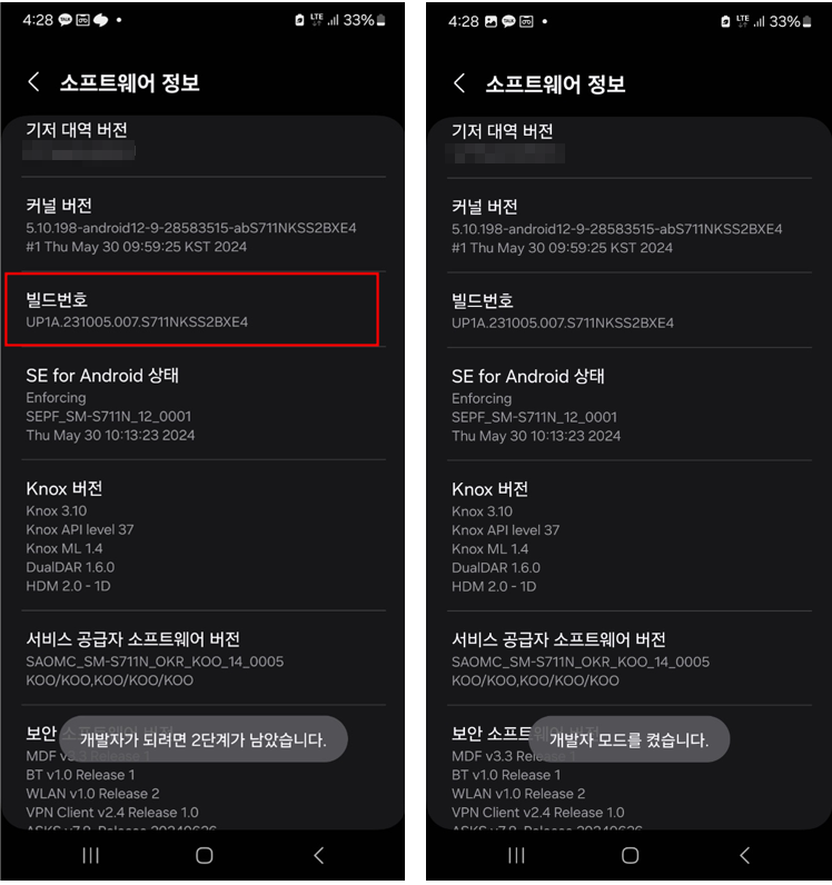 빌드번호 항목을 여러번 클릭하면 아래와 같이 개발자가 되려면 몇 단계가 남았는지 나타나며 계속 누르면 개발자 모드가 켜지는 부분을 확인 할 수 있습니다.