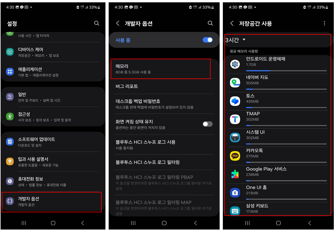 개발자옵션을 활성화 하면 설정메뉴에 개발자 옵션항목이 나타납니다. 해당항목을 클릭하면 메모리 항목이 나타나고 메모리 항목을 클릭합니다. 3시간동안 평균메모리 사용량을 확인 할 수 있습니다. 평균메모리 시간정보를 변경 하고 싶으면 3시간항목을 선택하면 리스트가 나타나고 알맞게 설정해서 확인 하면 됩니다.