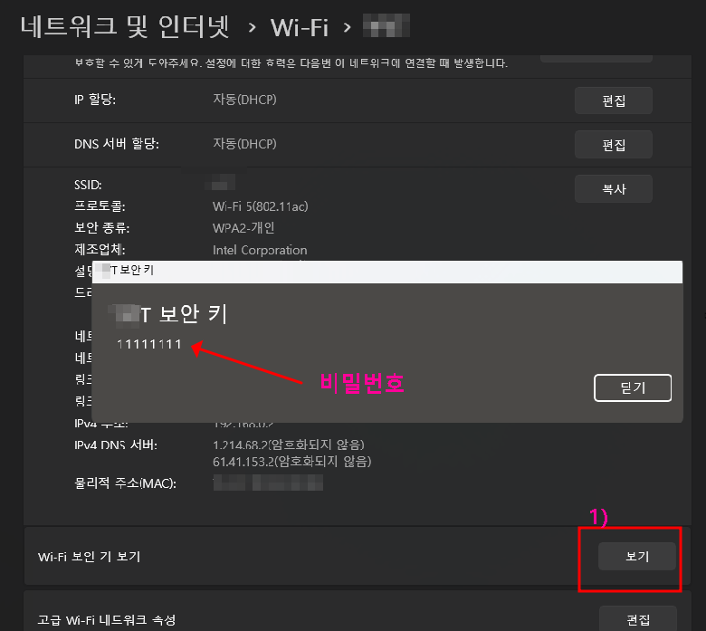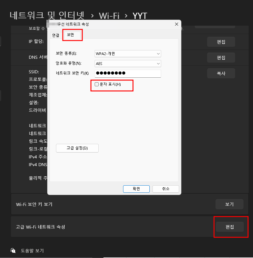 3. Wi-Fi보안키 보기 or 고급 Wi-Fi네트워크속성에서 확인