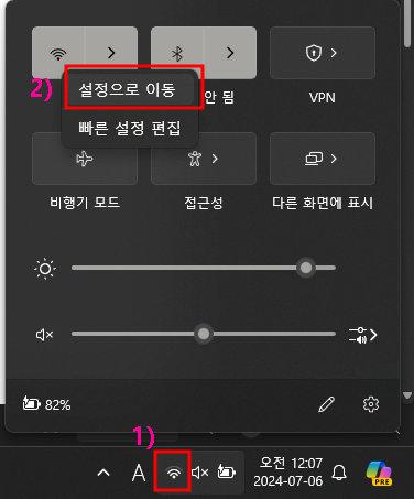 아래 그림과 같이 1)윈도우 오른쪽 하단위 와이파이 연결항목을 클릭 후 연결된 와이파이항목에서 마우스 우클릭을 합니다. 2)설정으로 이동이라는 메뉴를 클릭하면 Wi-Fi설정메뉴에 진입됩니다.