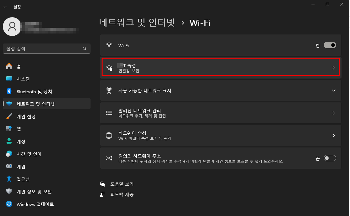 2. 연결된 와이 파이 속성정보를 클릭합니다.
