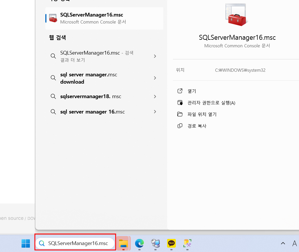 검색창에 SQLServerManager16.msc를 입력하여 실행합니다.