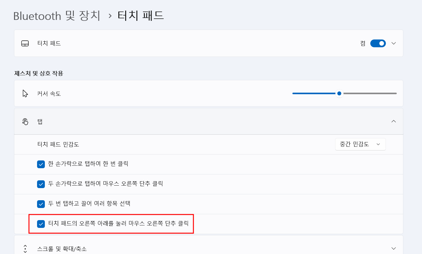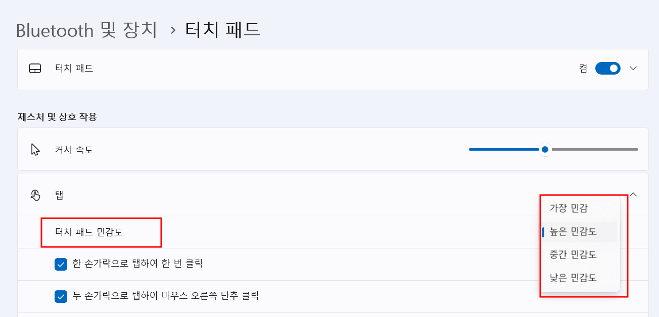 터치패드 민감도 설정에서 따라서도 버튼이 안눌려지는것 처럼 느껴질수도 있으니 민감도도 적절하게 조절해서 사용하시기 바랍니다.