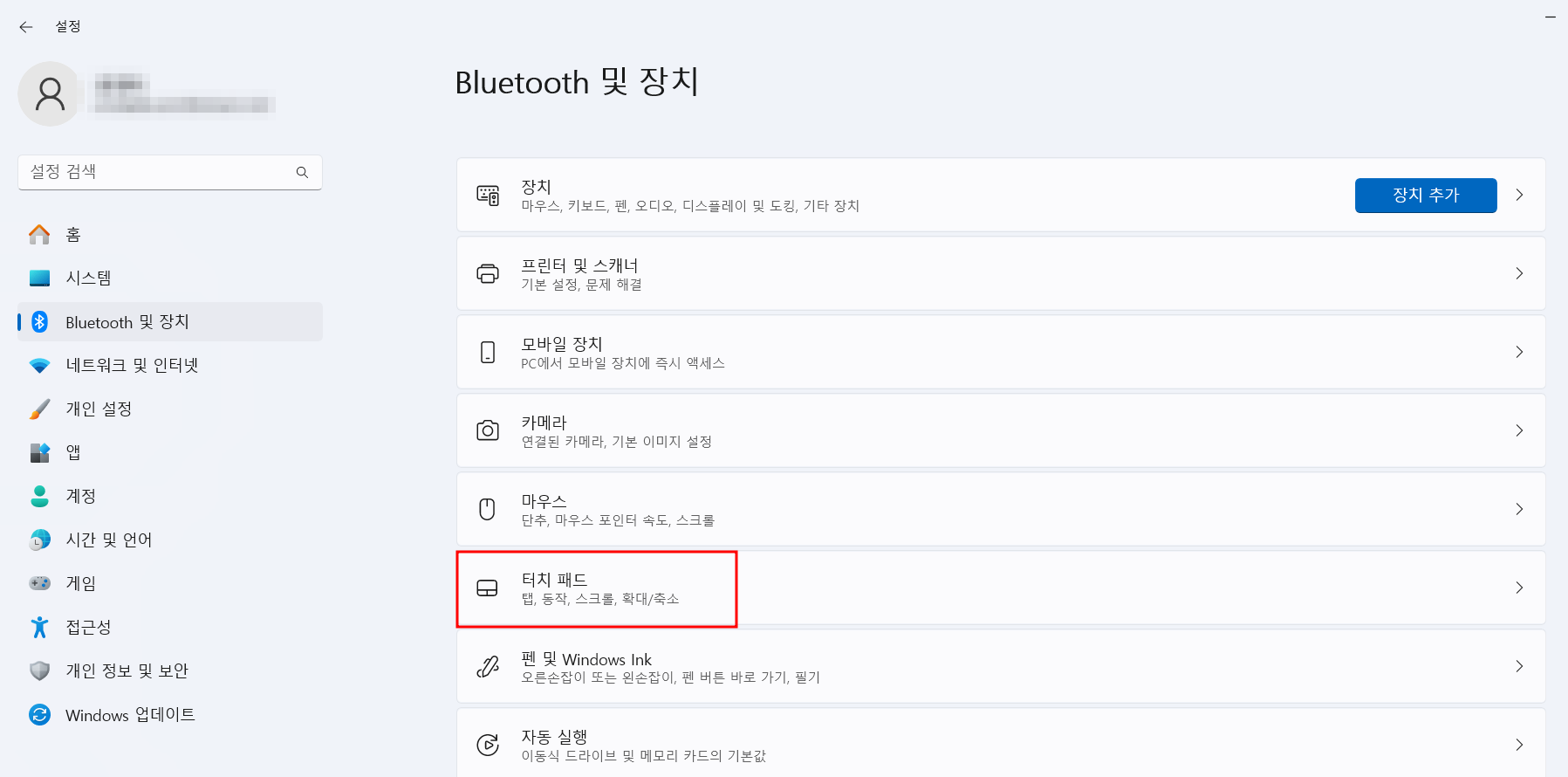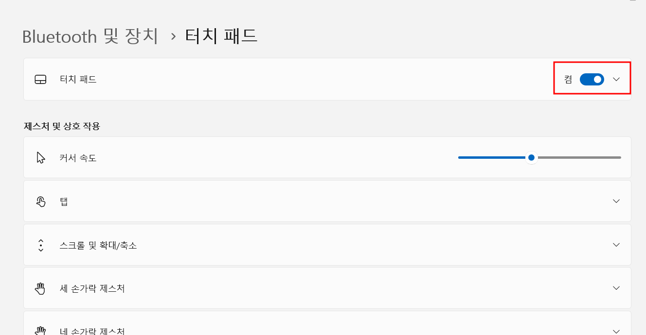 터치패드 화면의 오른쪽상단에 켬 ON/OFF하는 스위치버튼이 있습니다. 해당 버튼으로 켜기/끄기를 설정하면됩니다.