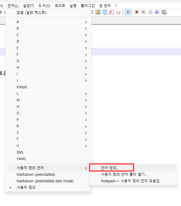 메뉴 -> 언어 -> 사용자 정의언어 -> 언어정의... 선택합니다.
