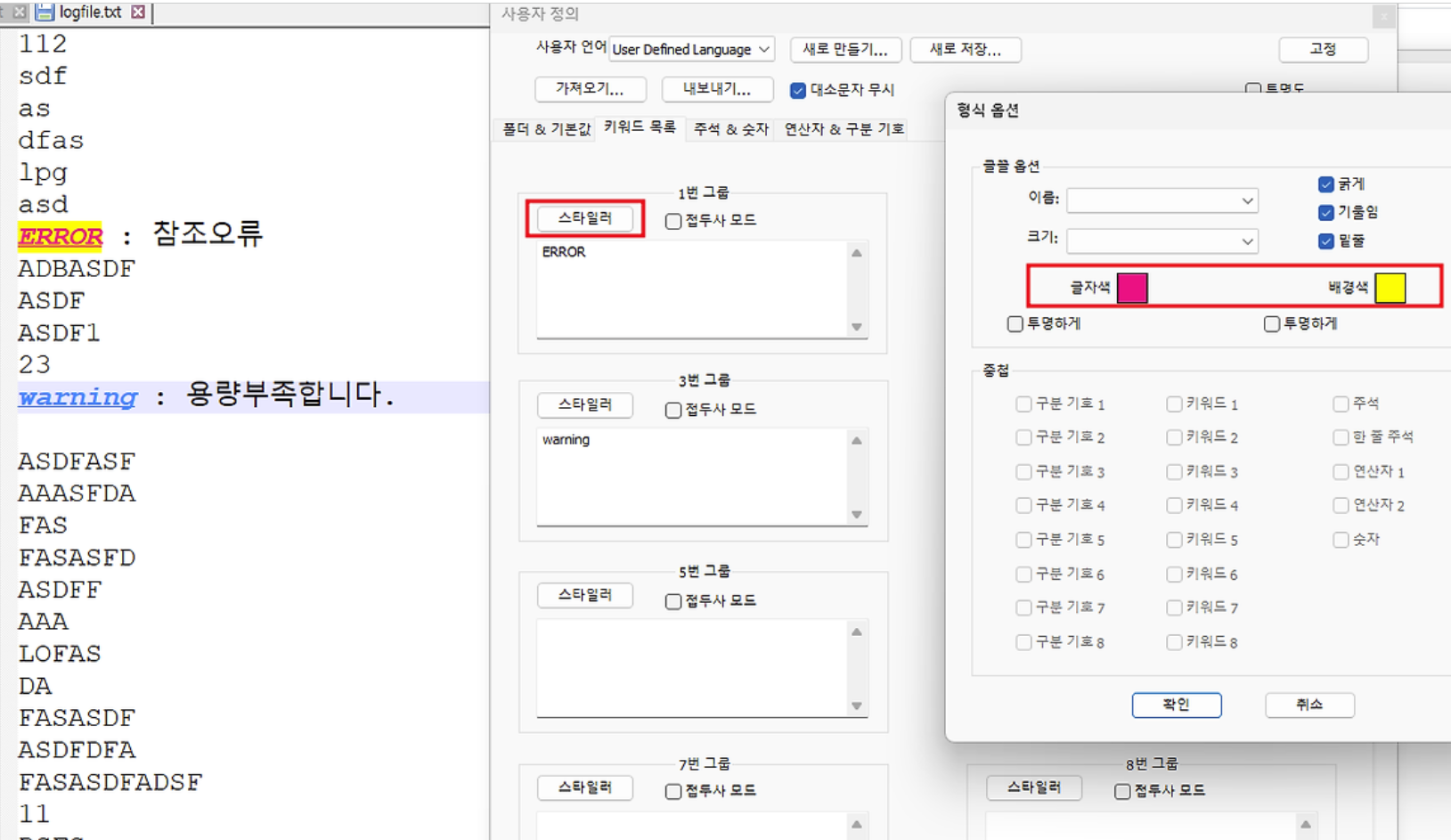 1번그룹에 ERROR키워드에 하이라이트효과를 넣어보겠습니다. 텍스트 입력항목에 ERROR라는 문자열을 입력합니다. 스타일러 항목선택 후 글자색 빨간색, 배경색은 노란색을 선택 후 확인 버튼을 누르면 하이라이트 효과가 된 부분을 확인 할 수 있습니다. 대소문자 무시하는 옵션을 체크시에는 대소문자도 무시하여 효과를 줄 수 있습니다.
