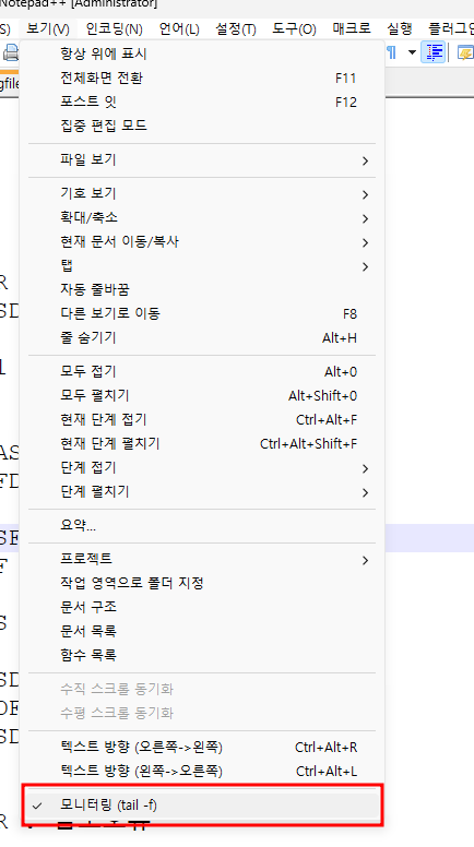 메뉴 -> 보기 -> 모니터링 (tail -f)를 체크하면 파일이 수정이 되지 않고 모니터링이 가능합니다.