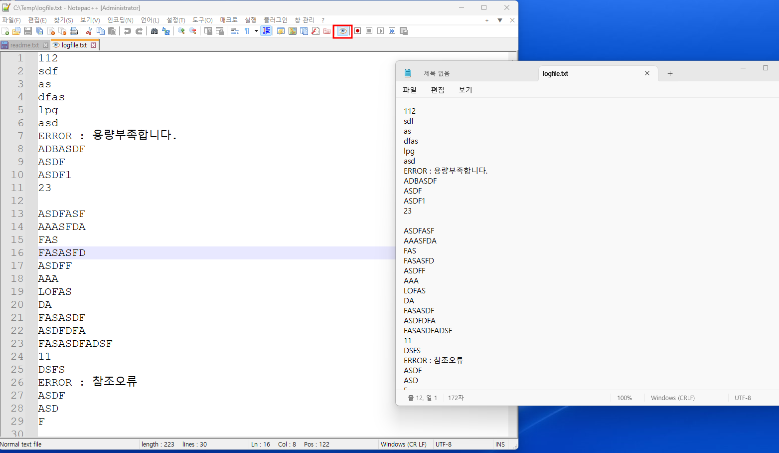 툴바쪽은 눈모양의 아이콘을 클릭하면 모니터링 모니도 선택이 됩니다. 테스트를 해보면 logfile.txt라는 파일을 열어서 저장시 NotePad++에서 모니터링후 문서 마지막으로 이동 하는 부분을 확인 할 수 있습니다.
