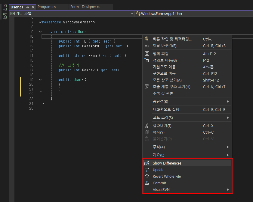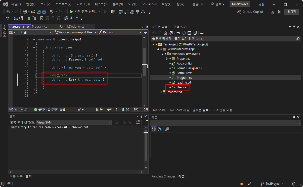 저장소에서 소스코드를 가져오면 아래와 같이 프로젝트가 다운된 부분을 확인 할 수 있습니다. User.cs파일에 Remark 속성값을 추가 후 Commit해보겠습니다.