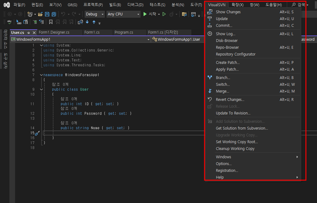 다운 받은 확장 프로그램을 설치 완료 후 비주얼스튜디오 2022를 실행하면 메뉴 상단에 VisualSVN 메뉴가 나타난 부분을 확인 할 수 있습니다.