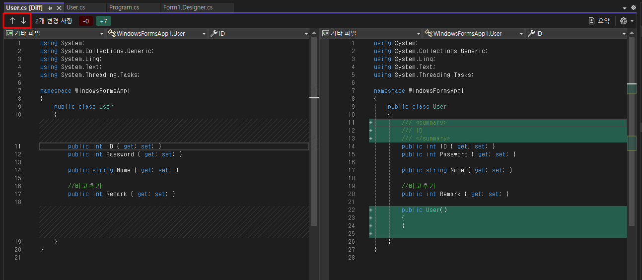 이전버전과 차이나는 부분을 알려주고 오른쪽 상단 위,아래 화살표로 변경된 부분을 이동하여 확인이 가능합니다.