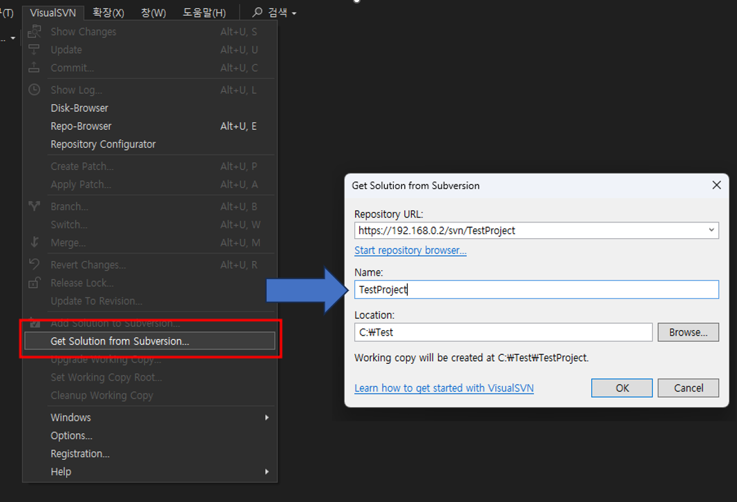 저장소에 있는 프로젝트를 가져오기 위해 Get Soultion from Subversion...을 클릭 합니다. Repository URL에 저장소 주소를 입력 후 Location에 로컬디렉토리정보를 입력 후 OK버튼을 클릭합니다.