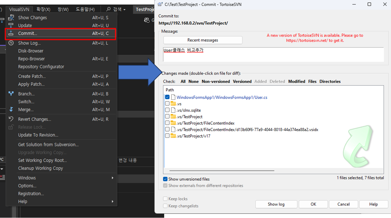 파일 수정 후 Commit항목을 선택하면 아래와 같이 TortoiseSVN에서 사용한 Commit창이 뜨고 사유정보를 입력 후 OK버튼을 클릭하면 커밋됩니다. TortoiseSVN에 익숙한분은 손쉽게 사용할 수 있을겁니다.