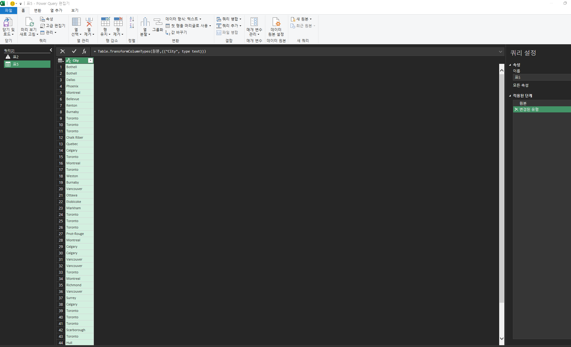 테이블에서 항목을 선택하면 아래와 같이 표 - Power Query편집기 항목이 나타납니다.