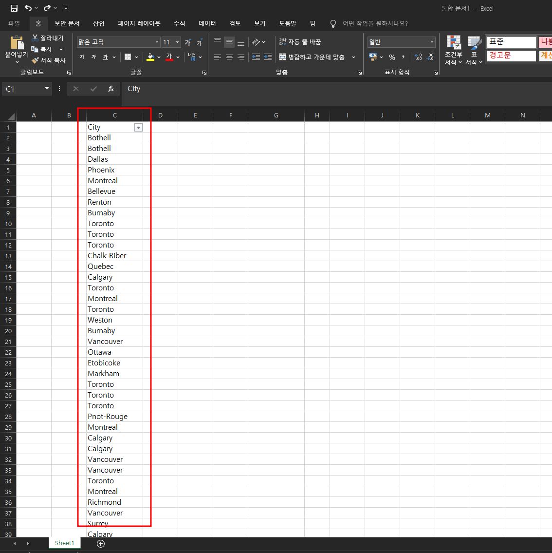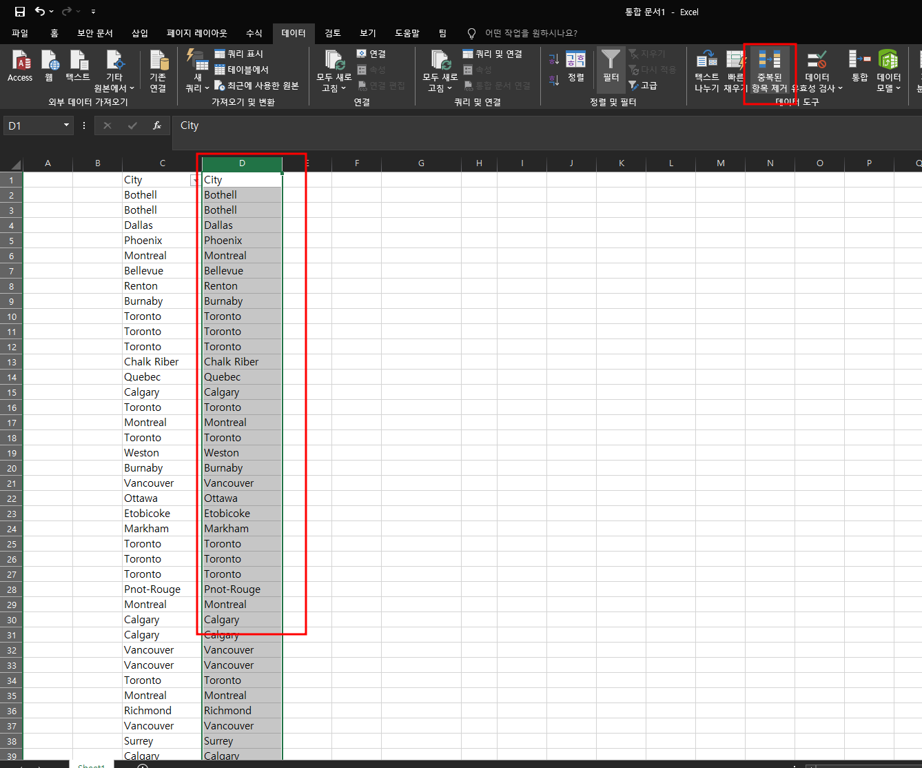 먼저 City의 중복된 항목을 제거해야합니다. C열의 값을 복사하여 D열에 붙여 넣습니다. D열을 선택 후 데이터 -> 중복된 항목제거 버튼을 클릭합니다.