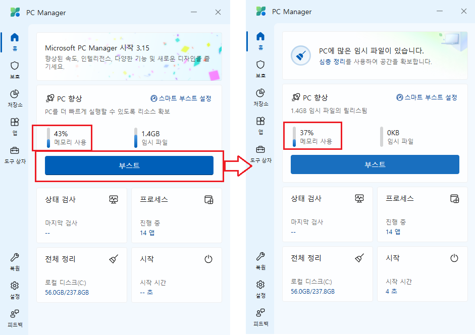 PC Manger프로그램을 설치 후 실행하면 아래와 같이 메인화면이 나타나고 부스트 버튼을 클릭하면 메모리가 정리되어 사용메모리 43%->37%로 늘어난 부분을 확인 할 수 있습니다.