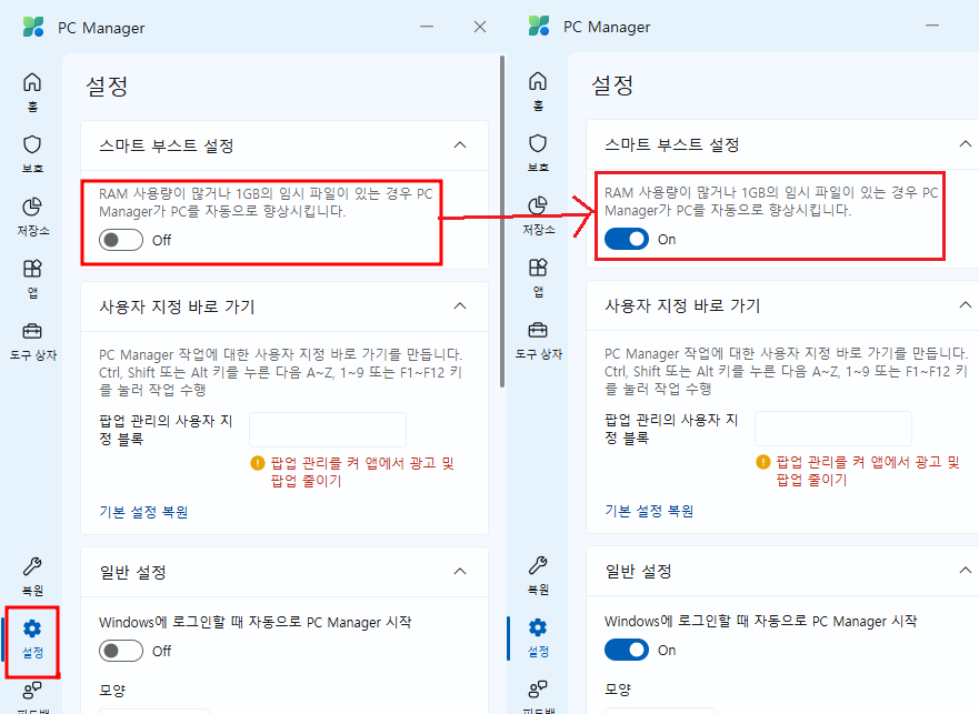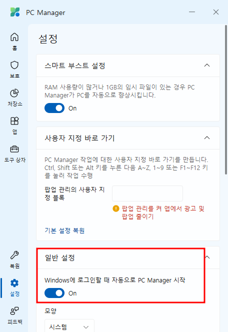 설정 -> 스마트 부스터 설정 값을 On으로 하면 Ram사용량이 많거나 1GB의 임시파일이 있을 경우 PC를 자동으로 향상시킨다고 하니 해당 부분을 설정해두면 메모리 부족한 문제를 어느 정도 해결이 가능할것 같습니다. 간혹 알수없이 \윈도우탐색기가 불필요하게 증가하는 부분이 있었는데 스마트 부스터를 설정해두면 좋을것 같네요..