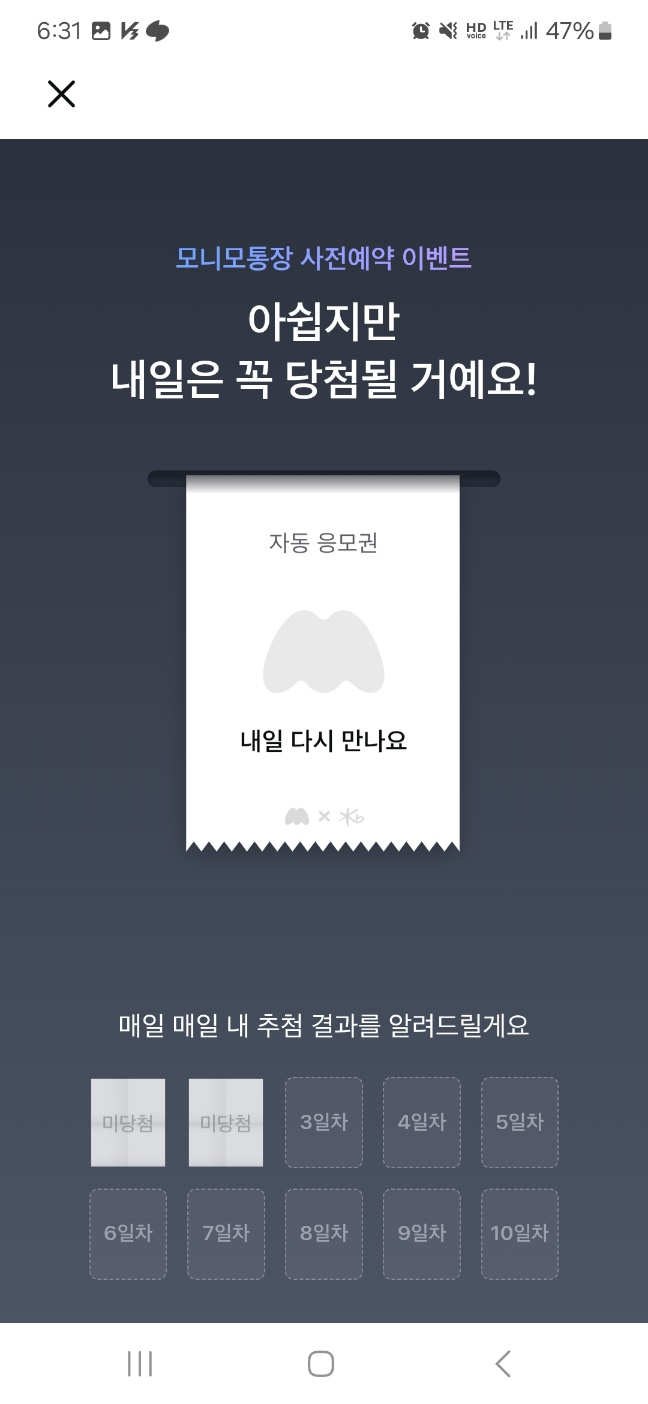 파킹통장을 만들려고 해서 모니모 통장이 나와서 만들예정인데 2일째 당첨결과를 확인중인데 아쉽게도 당첨이 되지 않았네요. 며칠 더 남았으니 행운이 오길 기대하며 며칠더 해봐야겠네요. 사전예약 이벤트 끝나고 200만원한도내에 4%금리로 제공한다고 하니 관심있으신 분들은 모니모 앱에서 보다 자세한 내용을 확인 해보시기 바랍니다. 5천원이라도 당첨이 됐으면 좋겠네요...