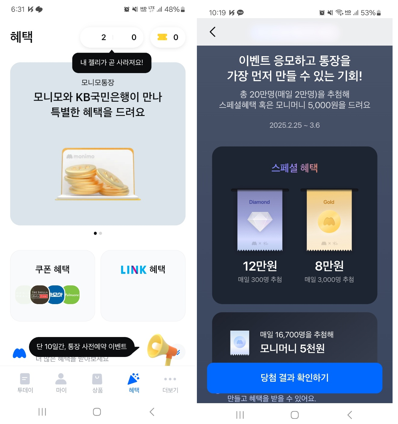 모니모통장 사전예약 이벤트를 시작하여 10일간 진행하고 있습니다. 2/25~ 3/6일까지 진행하고 있으며 매일 2만명 추첨하여 혜택을 주고 있으면 관심있으신 분은 이벤트 응모하여 혜택을 받으시기 바랍니다.