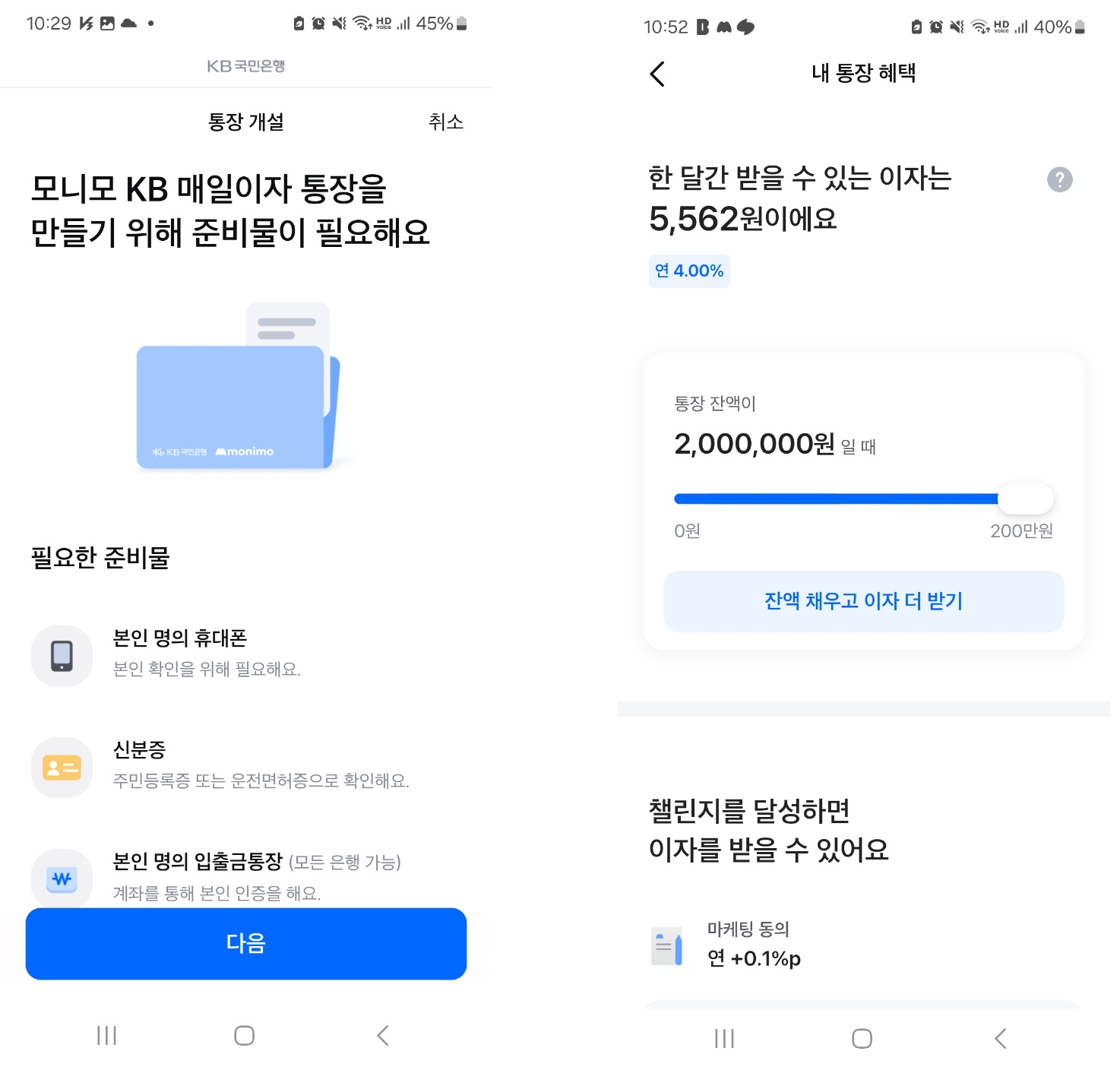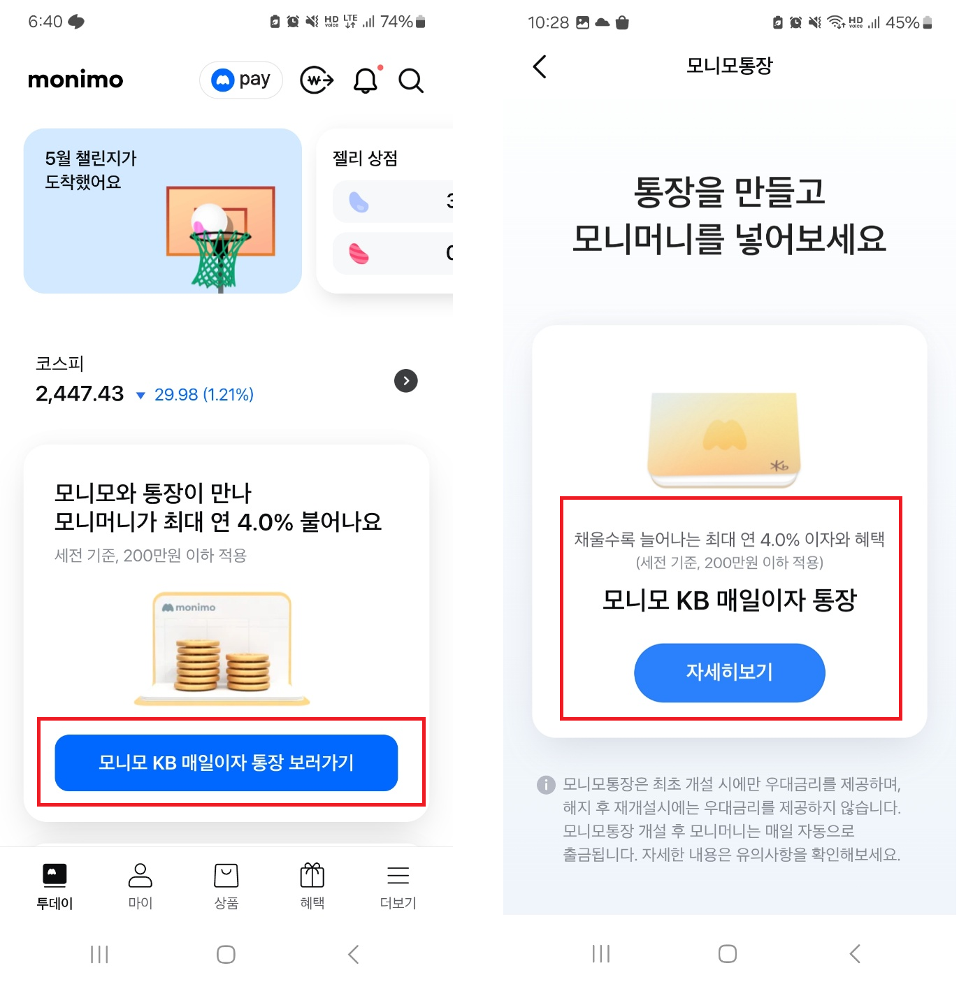 모니모 앱에 모니모 KB매일이자 통장을 선택하고 개설을 진행합니다. 최대 4.0%의 이자 혜택 (세전기준, 200만원이하적용)를 제공합니다.