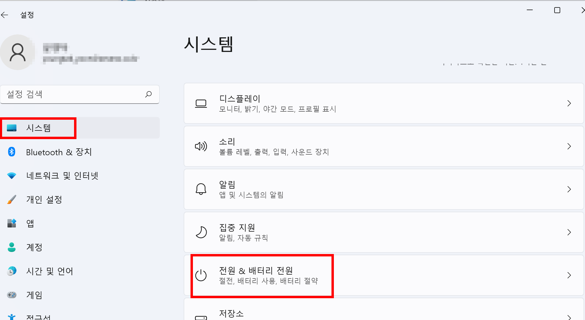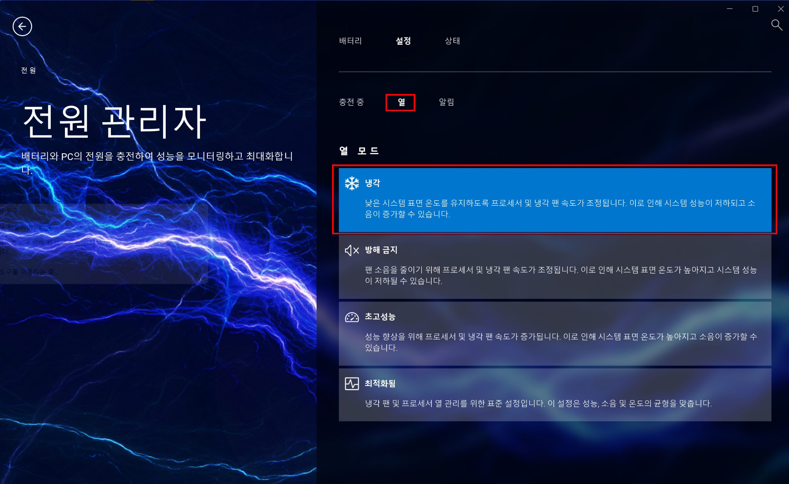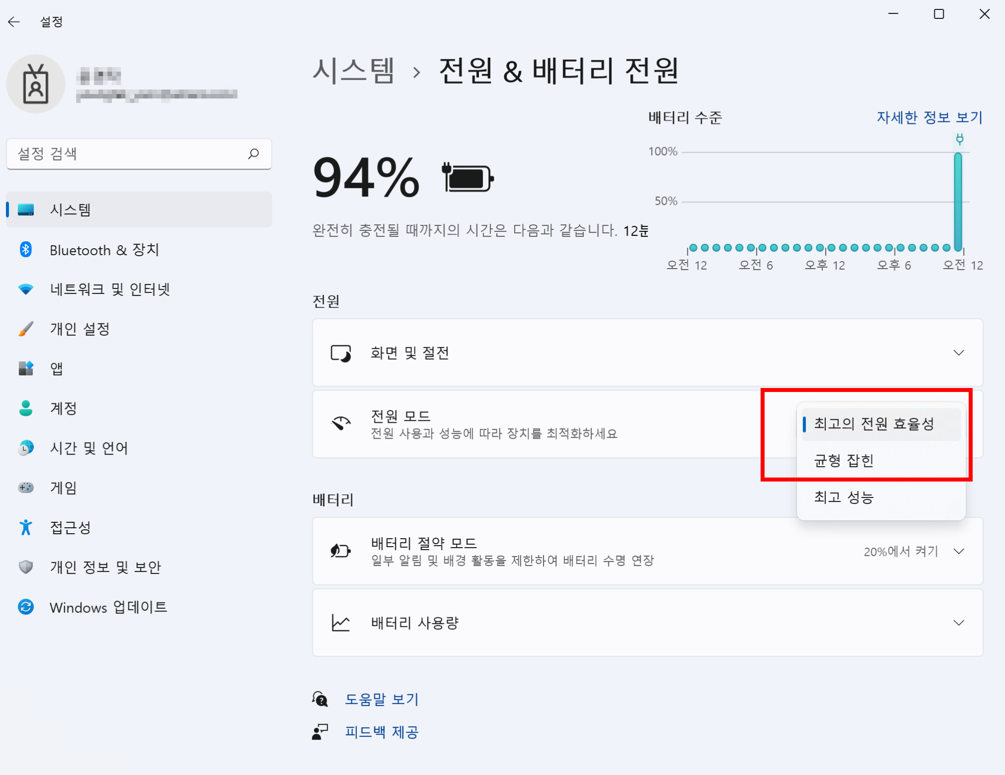 시스템 >> 전원 & 배터리 전원 >> 전원 모드 설정을 "최고의전원효율" 로 설정합니다.