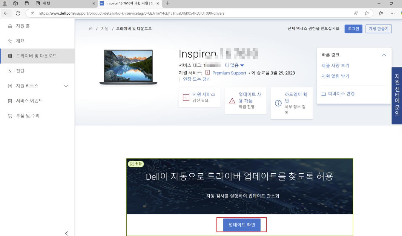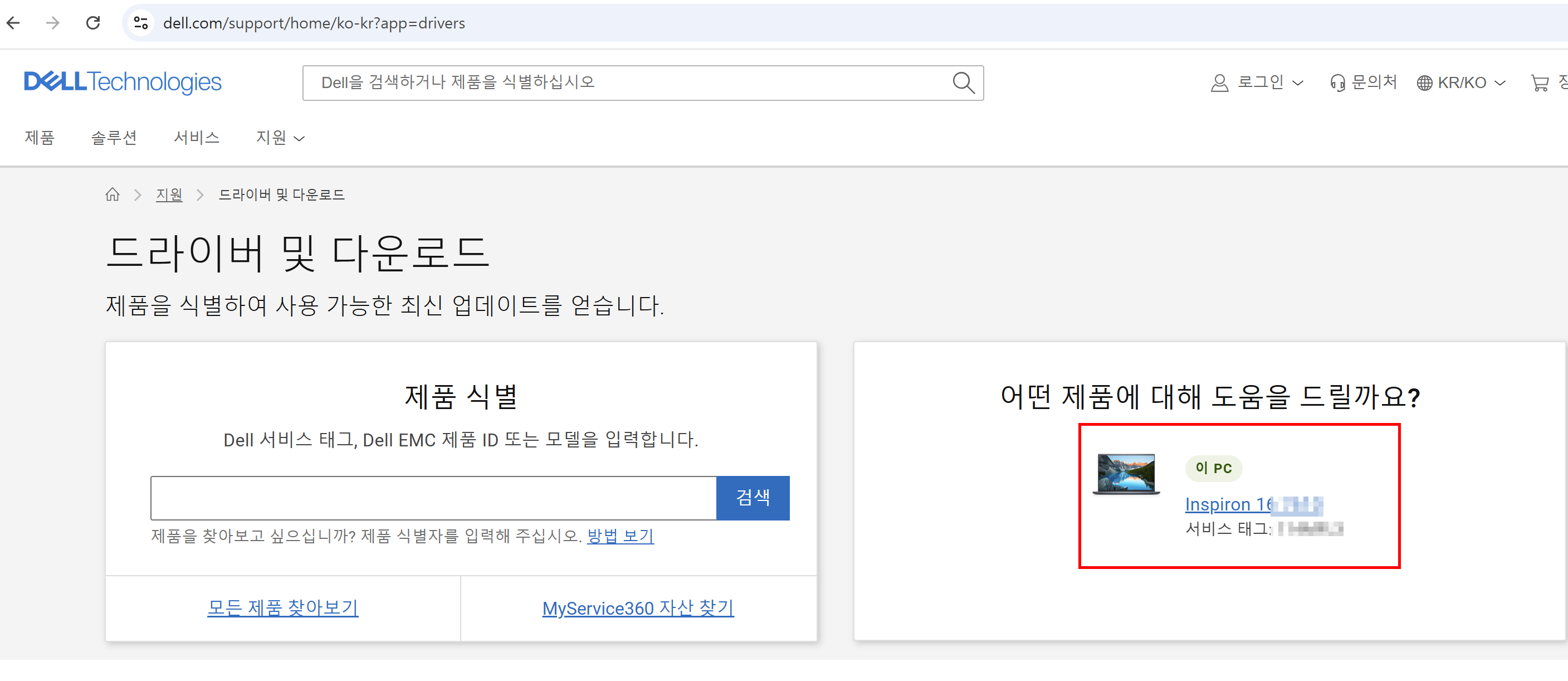 다음 페이지 링크로 접속합니다. https://www.dell.com/support/home/ko-kr?app=drivers