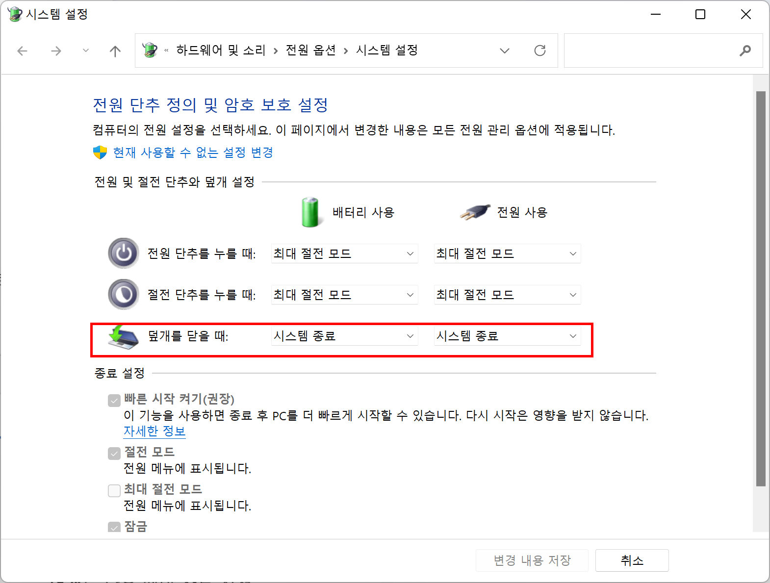 이 부분은 저 같은경우는 노트북 덮개를 닫았을때 절전모드로 기본값이 되어 사용되는 경우가 많은데 전원을 종료하고 빠르게 덮개를 닫았을경우 시스템이 종료되기전에 절전모드가 되고 이때 간혹 발열이 있는상태로 닫힐경우 열이 증가하는 경우가 있어서 노트북 덮개를 닫을때는 아예 시스템 종료 모드로 변경해놓고 사용합니다. 이렇게 해놓은 노트북을 닫은상태에서 시스템이 종료가 되기 때문에 종료되지 않은 상태에서 생기는 발열에 대한 부분은 방지가 됩니다.
