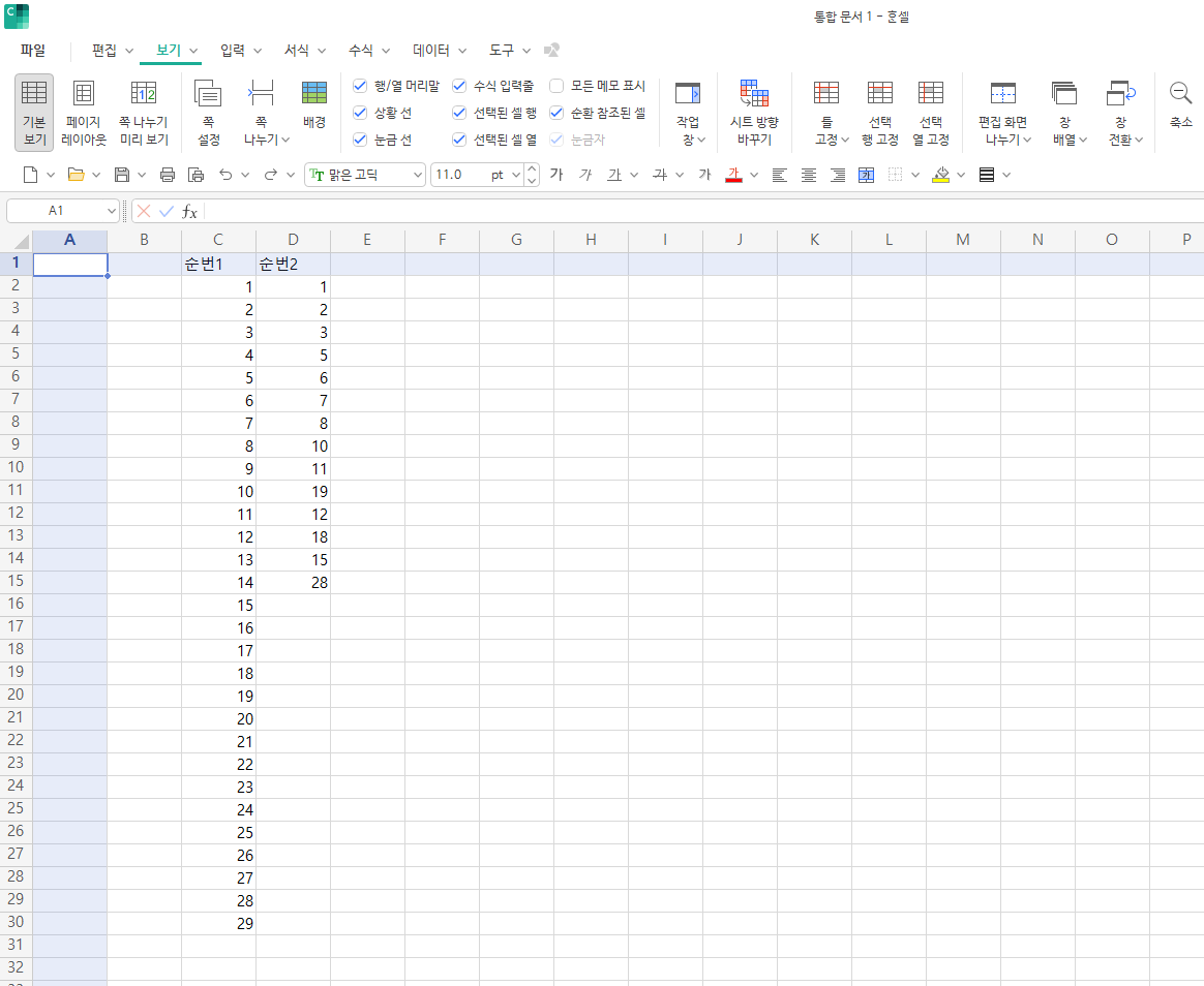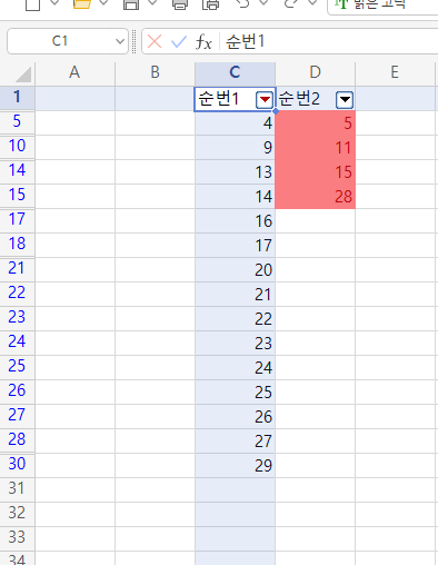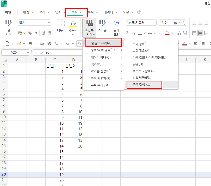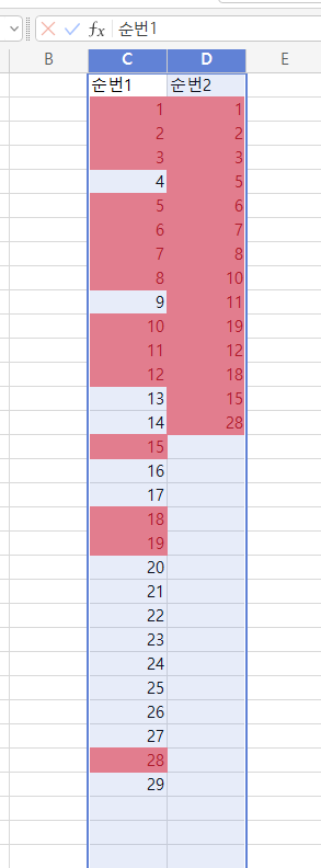 두열의 중복되는 항목을 찾거나 빠진부분을 찾을때 사용하는 방법입니다. 엑셀과 한셀 부분 내용은 동일하네요. 메뉴부분이 어디 있는지 잘 알고 있으면 손쉽게 일치하지 않는 항목을 찾을 수 있습니다. 조건부 서식을 이용하면 손쉽게 항목을 찾을 수 있습니다. 아래와 같이 순번1, 순번2 열을 비교해보겠습니다.